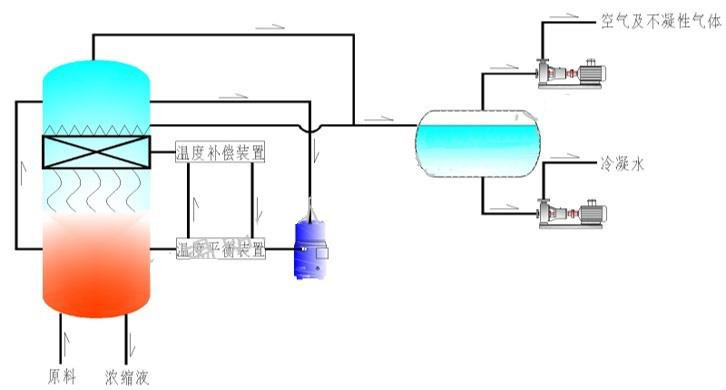 熱泵濃縮蒸發(fā)器的原理是物料的沸點隨著壓強的降低而降低。低溫節(jié)能濃縮設(shè)備整體保持真空狀態(tài),濃縮室的真空度約為95%~97%,在此壓強下水的沸點為35℃~37℃,系統(tǒng)無需配備進料泵,利用蒸發(fā)室的負壓將物料吸進蒸發(fā)室,通過強制循環(huán)方式將物料循環(huán)霧化,傳輸至換熱器上,物料中水分被蒸發(fā),物料連續(xù)循環(huán)霧化,通過蒸發(fā)室液位自動補料,濃度達到要求后作為濃縮液排出設(shè)備。濃縮液一般粘度較大,需采用泵抽出。