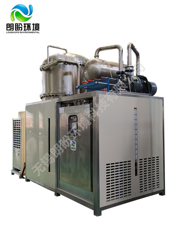 低溫蒸發(fā)結晶器的原理是物料的沸點隨著壓強的降低而降低。低溫節(jié)能濃縮設備整體保持真空狀態(tài),蒸發(fā)室的真空度約為95%~97%,在此壓強下水的沸點為35℃~37℃,系統(tǒng)無需配備進料泵,利用蒸發(fā)室的負壓將物料吸進蒸發(fā)室,通過強制循環(huán)方式將物料循環(huán)霧化,傳輸至換熱器上,物料中水分被蒸發(fā),物料連續(xù)循環(huán)霧化,通過蒸發(fā)室液位自動補料,濃度達到要求后作為濃縮液排出設備。濃縮液一般粘度較大,需采用泵抽出。