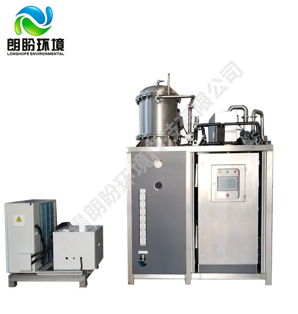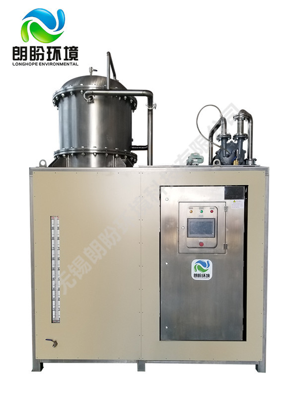 低溫節(jié)能濃縮設(shè)備的原理是物料的沸點(diǎn)隨著壓強(qiáng)的降低而降低。低溫節(jié)能濃縮設(shè)備整體保持真空狀態(tài),濃縮室的真空度約為95%~97%,在此壓強(qiáng)下水的沸點(diǎn)為35℃~37℃,系統(tǒng)無(wú)需配備進(jìn)料泵,利用蒸發(fā)室的負(fù)壓將物料吸進(jìn)蒸發(fā)室,通過(guò)強(qiáng)制循環(huán)方式將物料循環(huán)霧化,傳輸至換熱器上,物料中水分被蒸發(fā),物料連續(xù)循環(huán)霧化,通過(guò)蒸發(fā)室液位自動(dòng)補(bǔ)料,濃度達(dá)到要求后作為濃縮液排出設(shè)備。濃縮液一般粘度較大,需采用泵抽出。